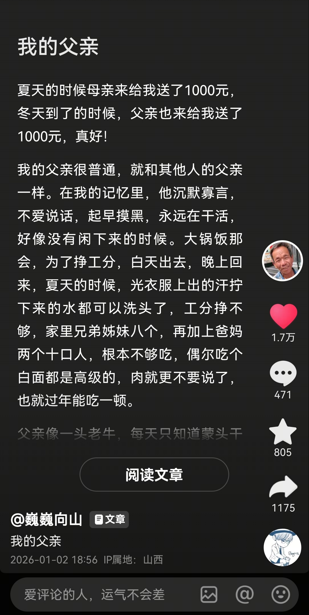 1月2日傍晚,因《我的母亲》一文走红的66岁农民工安三山,在社交平台发布新作《我的父亲》,引发全网热议。