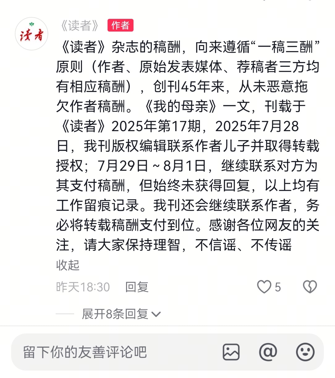 杂志社还进一步表示,《我的母亲》一文刊载于《读者》2025年第17期,2025年7月28日,该刊版权编辑联系作者儿子并取得转载授权;7月29日—8月1日,继续联系对方为其支付稿酬,但始终未获得回复,以上均有工作留痕记录。并承诺会继续联系作者,务必将转载稿酬支付到位。