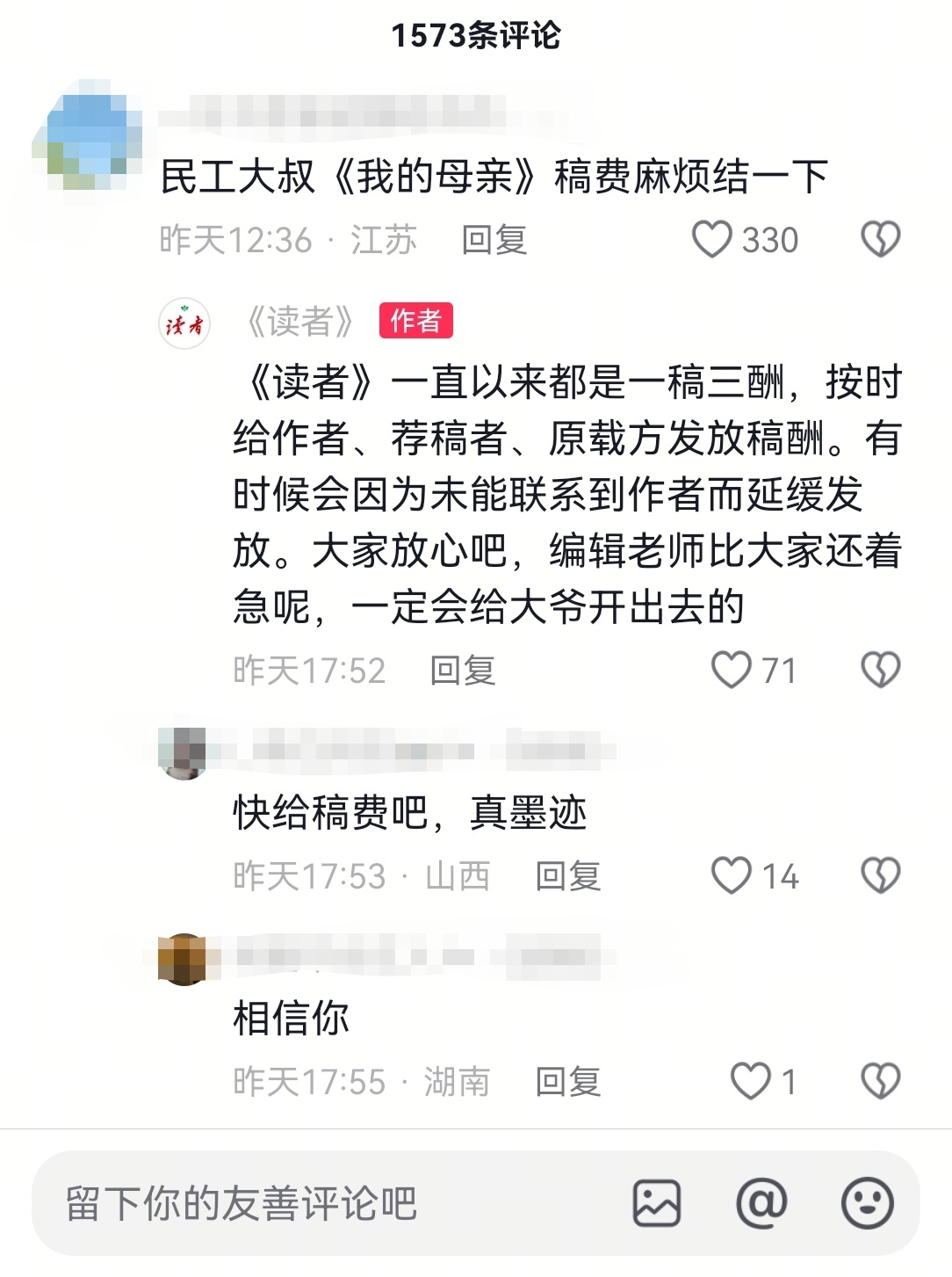 读者回应《我的母亲》稿费支付进展。