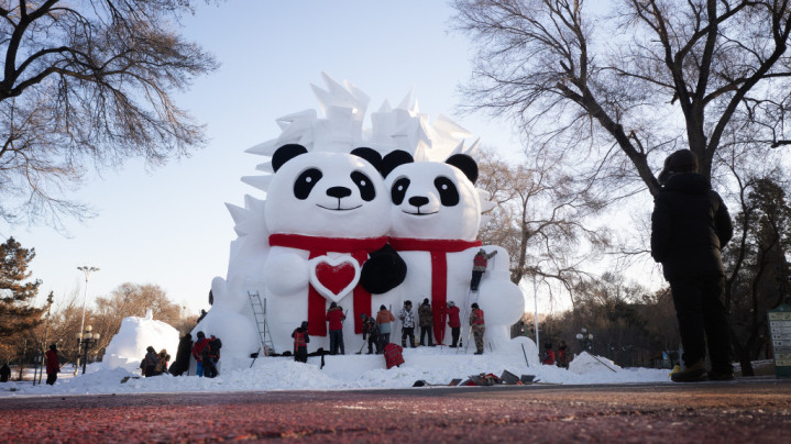 2025年12月12日,黑龙江哈尔滨,太阳岛雪博会大型雪雕《过新年》完工,该雪雕高16米,宽12米,用雪量1500立方米,由40位雕刻师用时3天完成。视觉中国图