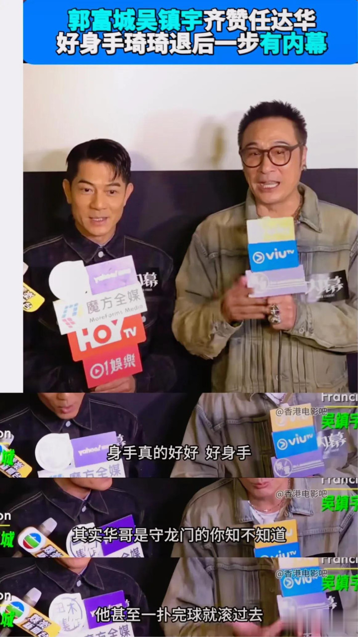 今天主演任达华没有出席,不知道是不是因为前两天出席活动摔倒的原因,媒体谈到最近出席活动摔倒的任达华,没想到吴镇宇跟郭富城也爱吃瓜,他俩居然也看到报道,吴镇宇更是爆料任达华曾经是明星足球队守门员,那个动作是顺其自然,两个人都称赞华哥好身手,吴镇宇更是调侃任达华是故意摔倒制造话题,没看他老婆琦琦主动退后给老公让位置!还说这一个话题港媒要写好几天,他们都没有这么高的热度!现场笑声一片,网友说不愧是吴镇宇,说话就是这么一如既往的好笑!