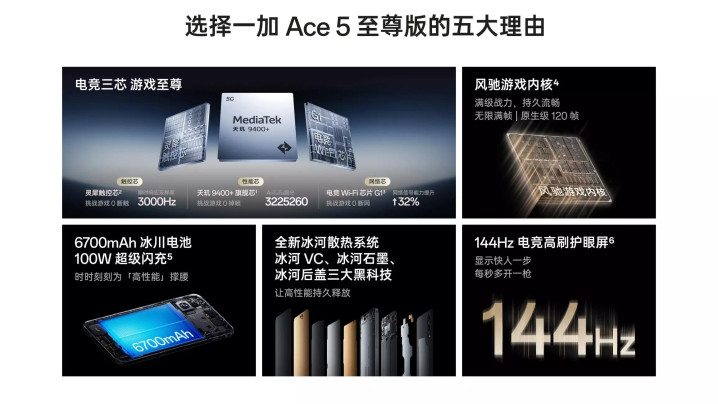 一加Ace5至尊版国补后12GB+256GB版1699元,核心卖点是电竞三芯和风驰游戏内核,搭配晶盾玻璃和IP65防水,游戏体验拉满。